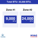 • Capacity: Total: 33,000 BTU//Zone 1: 9,000 BTU//Zone 2: 24,000 BTU