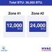 • Capacity: Total: 36,000 BTU//Zone 1: 12,000 BTU//Zone 2: 24,000 BTU