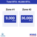 • Capacity: Total: 45,000 BTU//Zone 1: 9,000 BTU//Zone 2: 36,000 BTU