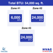 • Capacity: Total: 54,000 BTU//Zone 1: 6,000 BTU//Zone 2: 24,000 BTU//Zone 3: 24,000 BTU