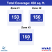 • Coverage Area: Total: 450 sq. ft.//Zone 1: 150 sq. ft.//Zone 2: 150 sq. ft.//Zone 3: 150 sq. ft.