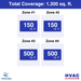 • Coverage Area: Total: 1,300 sq. ft.//Zone 1: 150 sq. ft.//Zone 2: 150 sq. ft.//Zone 3: 500 sq. ft.//Zone 4: 500 sq. ft.