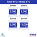 • Capacity: Total: 33,000 BTU//Zone 1: 6,000 BTU//Zone 2: 6,000 BTU//Zone 3: 9,000 BTU//Zone 4: 12,000 BTU