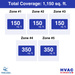 • Coverage Area: Total: 1,150 sq. ft.//Zone 1: 150 sq. ft.//Zone 2: 150 sq. ft.//Zone 3: 150 sq. ft.//Zone 4: 350 sq. ft.//Zone 5: 350 sq. ft.